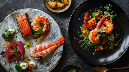 Plate with mix of exotic seafood products in modern luxury restaurant.Macro.AI Generative.