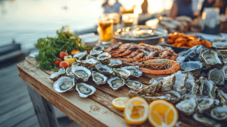 Vibrant seafood platter showcases fresh shrimp, lobster, and oysters, beautifully arranged with lemon and herbs on a rustic wooden table. Ideal for gatherings.