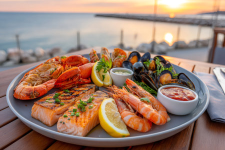 Delicious seafood platter with grilled salmon, shrimp, mussels, and lobster, enjoyed by the sea at sunset