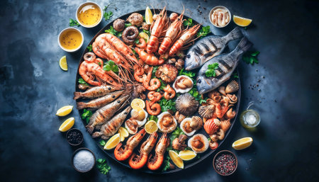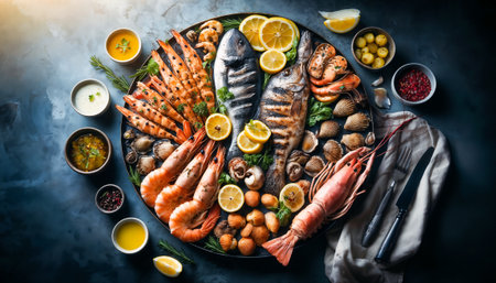 Delicious Seafood Platter of Grilled Fish, Shrimp, and Shellfish with Lemon slices and sauces. top view.