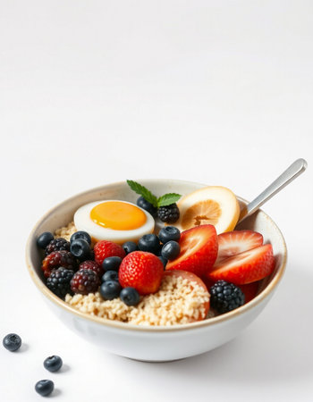 Healthy breakfast bowl with oatmeal, berries and egg on white background