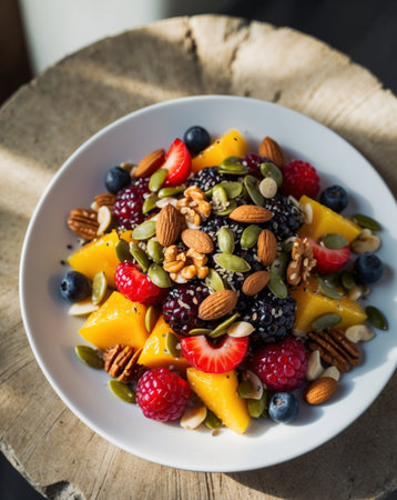 AI Generated. Captivating Shots of Fruit Salads with Nuts and Seeds for Adding Crunch and Nutritional Value