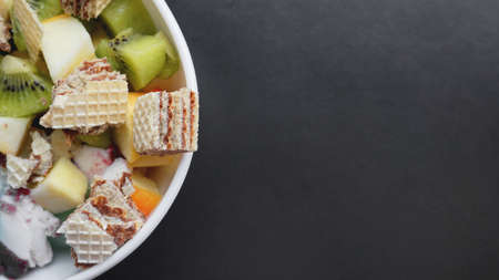 Close up desert with fresh fruit and ice cream. Mixed Fruit With with waffle and fruit ice on black background