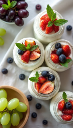 A delightful arrangement of creamy yogurt parfaits in glass jars showcases vibrant strawberries, blueberries, and figs, garnished with fresh mint leaves. This visually appealing scene, complemented by a bowl of green grapes and dark grapes, evokes a sense of freshness and indulgence, perfect for a healthy snack or dessert.