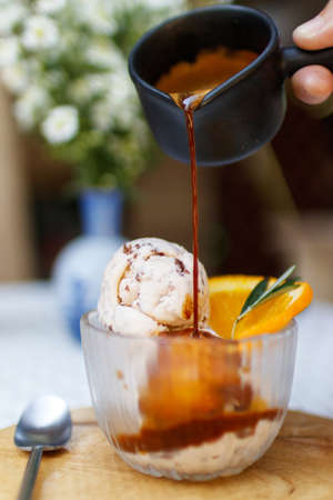 Pouring coffee on ice cream to make an affogato coffee on a garden table background.
