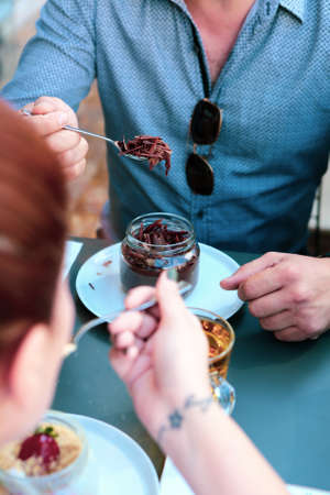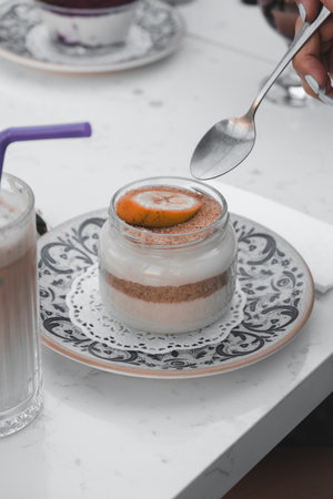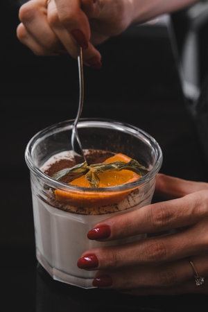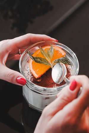 Customer eating sweet creamy orange dessert serving on square cut plate in restaurant. Delicious cake decorated by dried citrus, cherry and mint, close up picture