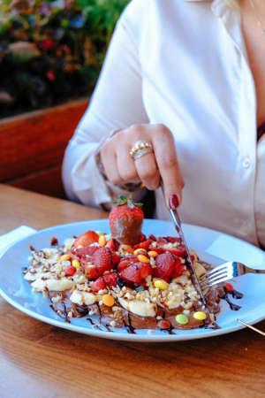 Mature woman eats toast with cut strawberries and cream at table on outdoors cafe terrace