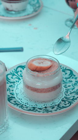 Close up photography of a fancy panna cotta with strawberries. Shallow dof