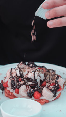 Chocolate waffle topping with scoop of vanilla and strawberry ice cream, whip cream, sliced strawberry, mint leaves, icing and chocolate sauce on blue plate at dessert cafe in Bangkok, Thailand.