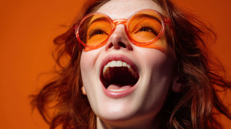 Joyful young caucasian woman with red hair and orange sunglasses against orange background.
