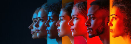 Row of diverse men and women facing sideways with multicolored gradient symbolizing inclusion and equity. Representation of multiracial group.