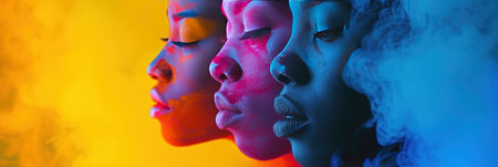Profile view of diverse individuals against colorful backgrounds, showcasing diversity.
