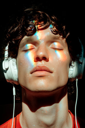 A close-up portrait of a young man wearing large white headphones wireless