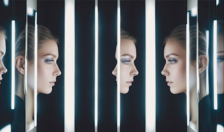 A woman stares into a series of vertical lights, creating a cool, reflective effect