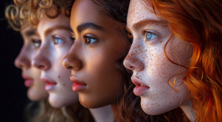 Profile side view portrait of diverse young beautiful women.AI Generative.