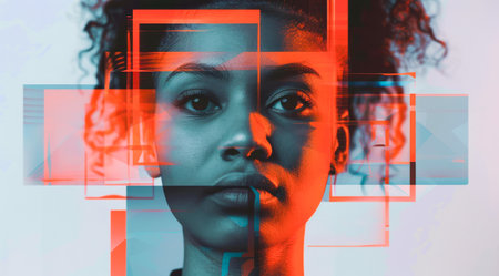 Close up portrait of a young woman featuring double exposure with glitch art elements
