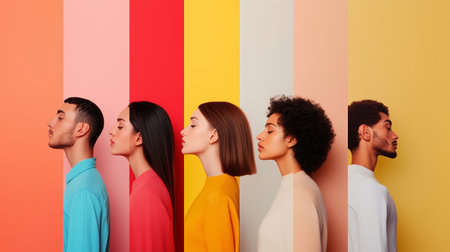 Diverse group of individuals in profile standing against a vibrant striped wall showcasing color and unity in an artistic display