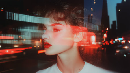 Urban night portrait of a young woman with vibrant city lights in the background