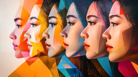 A captivating abstract portrayal of diverse Asian women in profile, celebrating individuality with striking colors and rich contrasts that highlight their expressions and emotions.