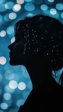 A woman stands against a backdrop of softly glowing blue lights, creating a serene atmosphere. Her silhouette carries an ethereal quality enhanced by the shimmering details in her hair.