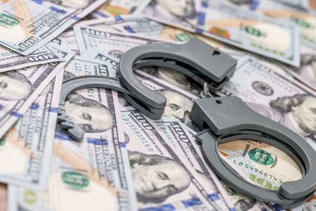 Handcuffs with hundred dollar bills as background. Crime or arrest concept.