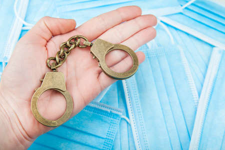 Adult male arrested and handcuffed.Man under Arrest.Man with his hands handcuffed in criminal concept.Financial offense.