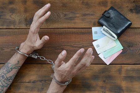 Cuffed hands of tattooed criminal suspect of carding and fake credit cards with cash in purse as evidence for investigation. Above view to old prison wooden table
