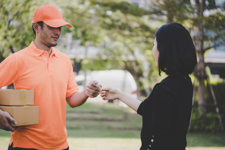 Cheerful asian woman hand accepting a delivery of boxes from deliveryman. Satisfy with the stuff in the boxes.