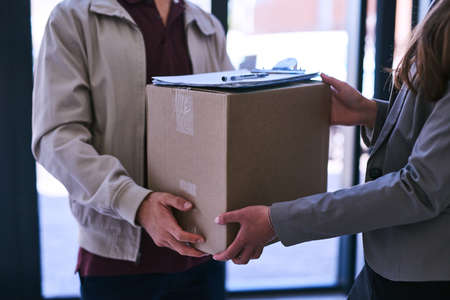 Door to door delivery done wherever you are. Cropped shot of a courier making a delivery to a businesswoman at work.