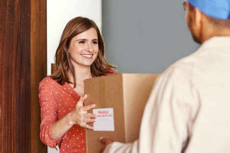 A delivery courier hands over cardboard boxes of goods to a woman near the door of her house.