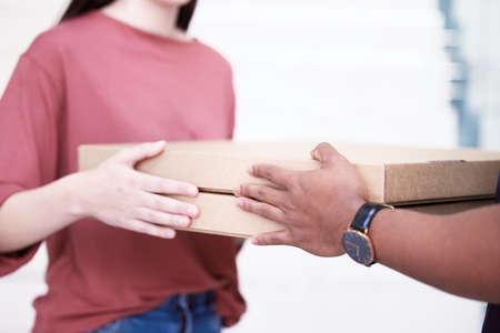 Woman hand accepting a delivery of boxes from deliveryman. Home delivery courier service and shipment concept