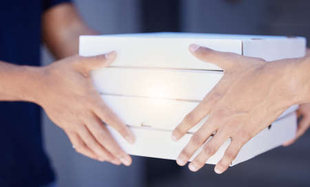 Delivered to you, hot and fresh. Closeup shot of an unrecognisable man delivering pizzas to a customer.