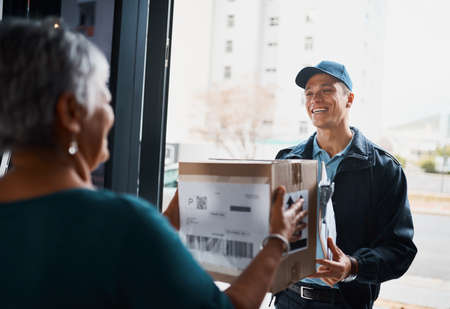 Another successful delivery made. Closeup shot of an unrecognisable man making a delivery to a customer at their home.