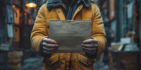 A person holding a cardboard box with a blurred background and space for your text