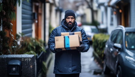 Local delivery worker on duty delivering cardboard boxes to customer to their house.