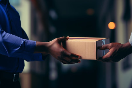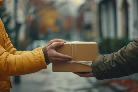 A scene depicting two individuals exchanging a brown cardboard box at a doorstep, highlighting themes of delivery, interaction, and urban living.