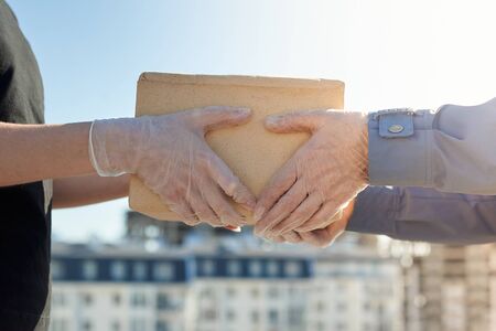 Deliveryman in rubber gloves gives a package to a customer. Delivery service in quarantine. The effect of the covid-19 pandemic.