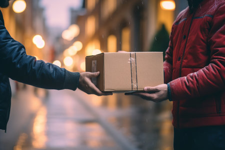Delivery worker passes a parcel to client during online shopping transaction, emphasizing e-commerce and home delivery services.