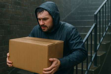 Exhausted person delivering cardboard package during a downpour, facing bad weather and potential damage