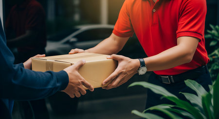 Delivery worker passes a parcel to client during online shopping transaction, emphasizing e-commerce and home delivery services.