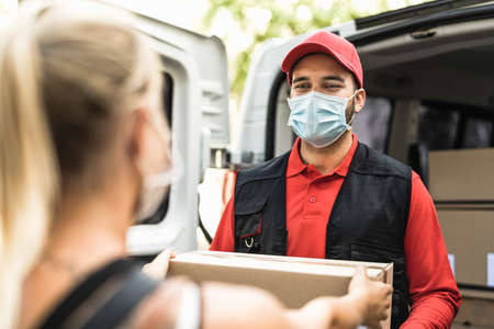 Delivery man at work wearing face mask - Young woman receiving an online order from courier express