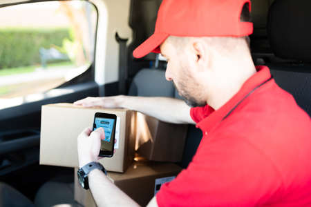Male worker scanning the barcode of a shipping label on a package. Delivery man taking a picture of a parcel before delivering it at the door