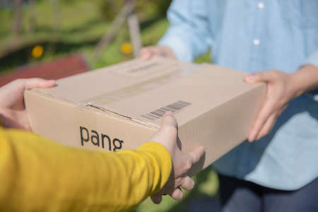 Home delivery service and working service mind, Woman customer hand receiving a cardboard boxes parcel from delivery service courier.