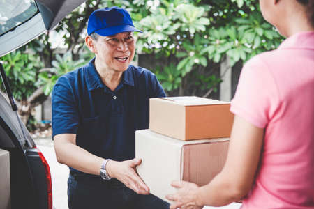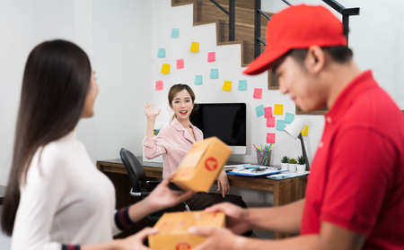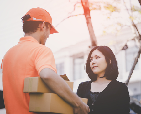 The postman delivered the parcel home with a smile and a happy face. Young Asian woman taking a box from the postman at the door.