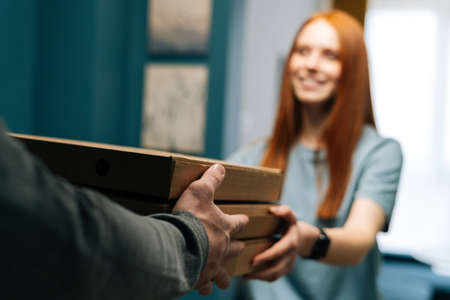 Close-up selective focus of young woman receiving boxes with pizza from courier male on doorway at home. Back view of delivery man delivering boxes with food to female client at apartment.