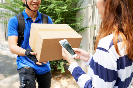 Courier delivering package to customer at home, completing online shopping order and representing e commerce and online payment