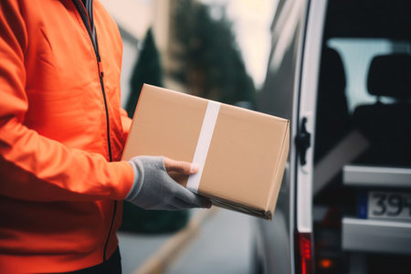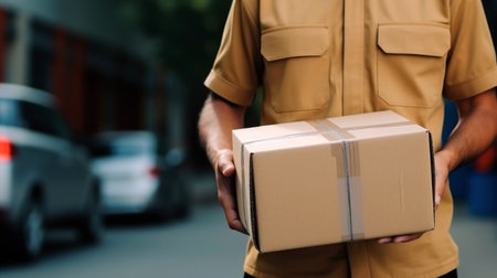 delivery man holding a cardboard box on the street, closeup