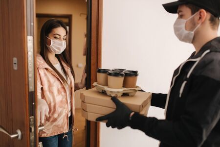 Man delivery pizza and coffe to customer in mask and gloves. Woman open door and take order. Coronavirus theme