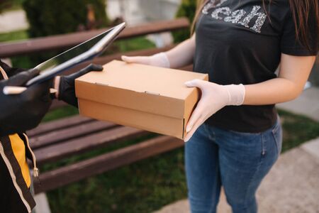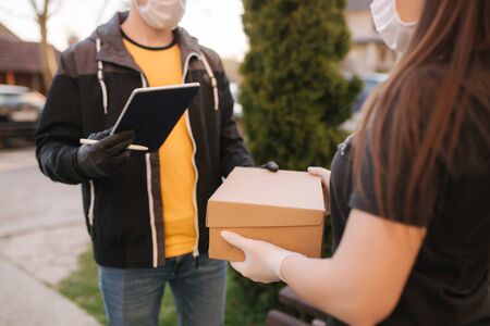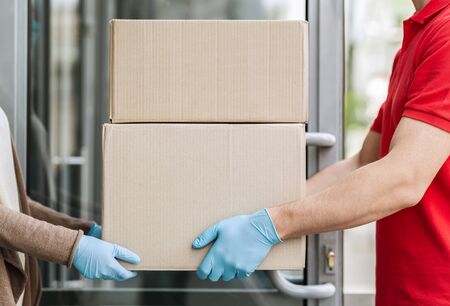 Online shopping and delivery to door concept. Courier in medical gloves delivers parcel to house during pandemic