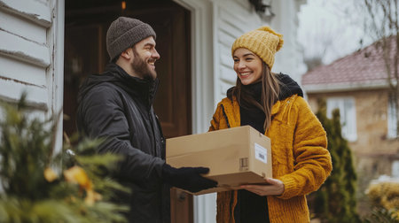 A cheerful woman receives a package at her doorstep from a friendly delivery man during the winter, both smiling warmly in cozy winter clothing.